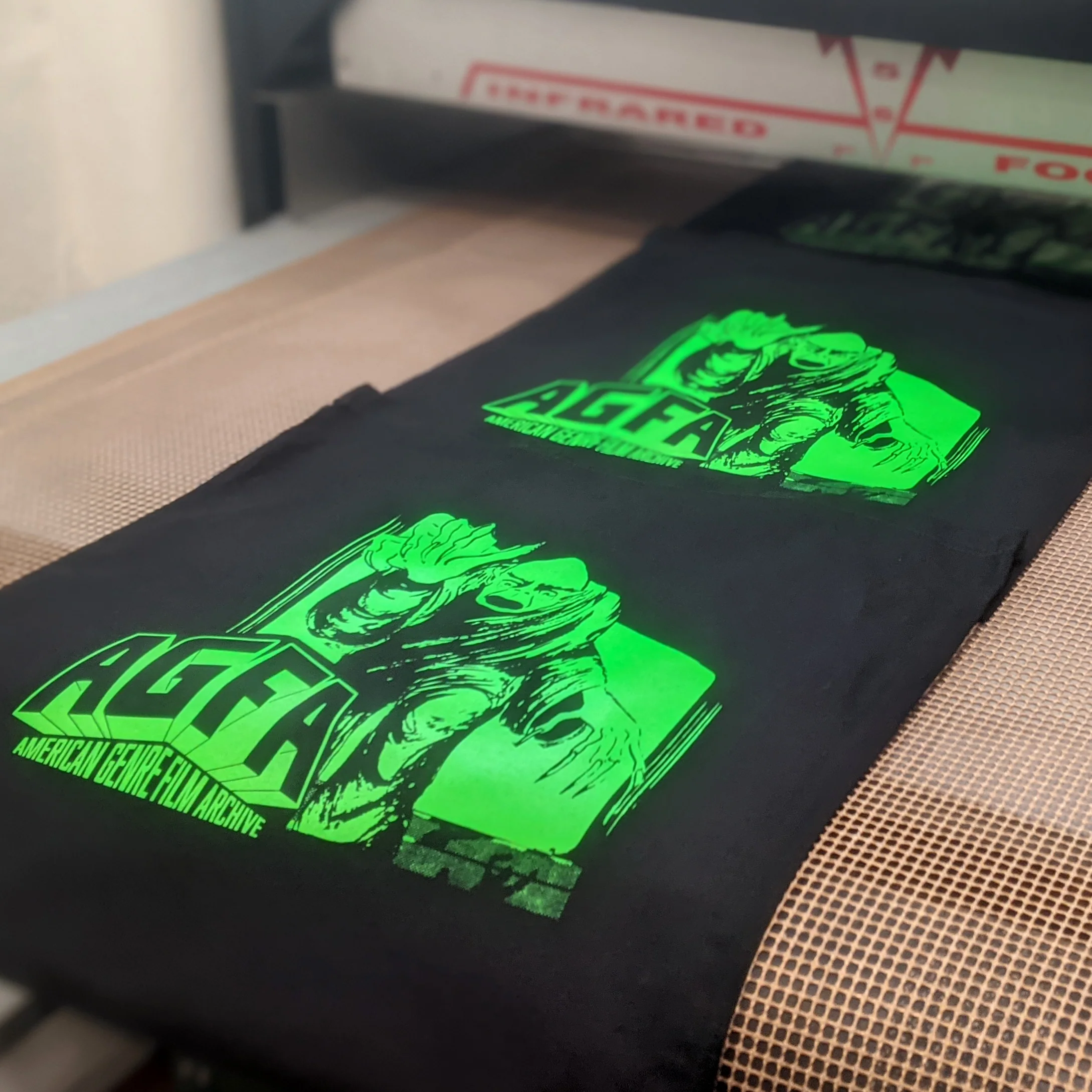 Screen printed in-house by Speed Blur at our print studio, VS Press, using glow-in-the-dark water-based ink, this black 100% cotton tote measures 15" W x 16" H (not including the handles). Charge this monster up under UV light and it will glow in the dark for a while!