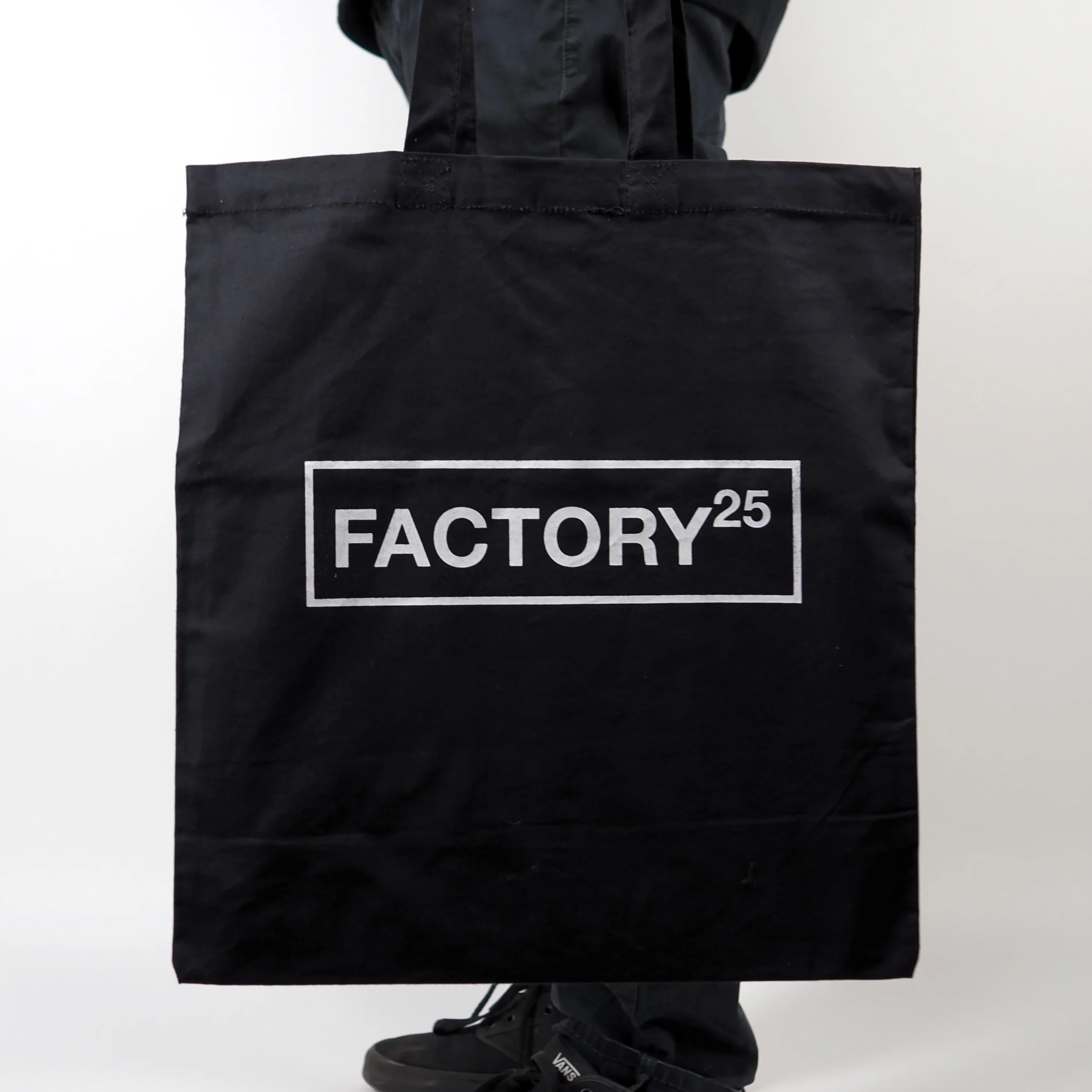 Show your love for Factory 25. Silkscreened black tote.