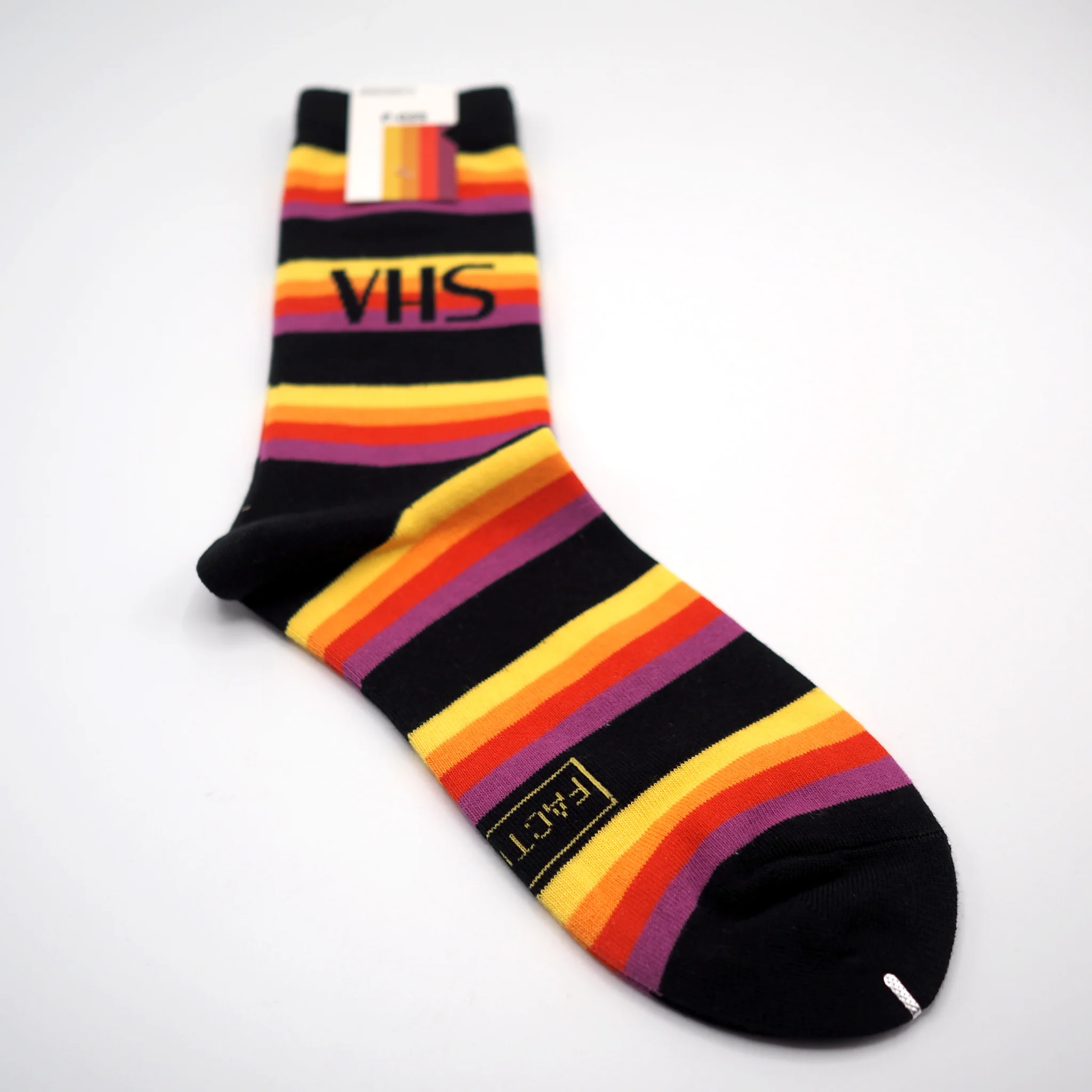 Socks for the cinephile and lover of physical media. The stripes harken back to the classic VHS tape slipcase. Never forget to be kind and rewind...