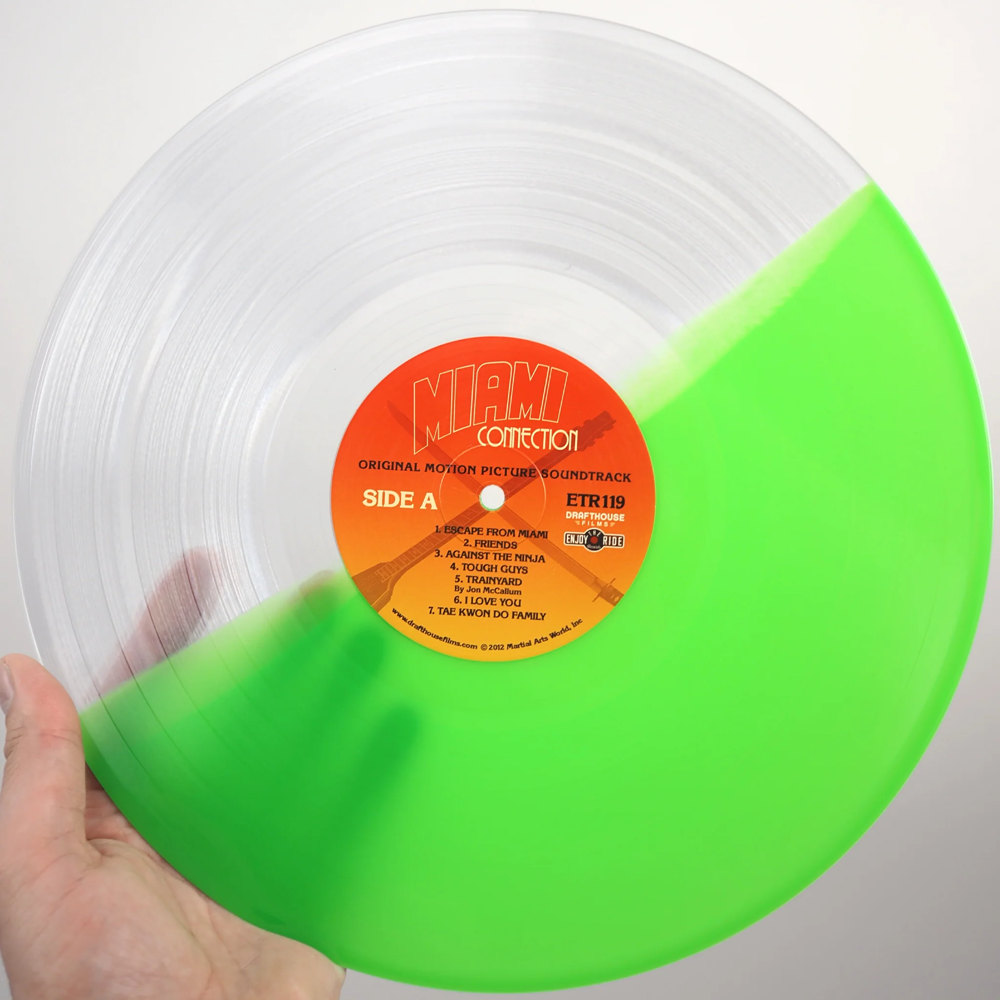 These are VinegarSyndrome.com exclusive MIAMI CONNECTION soundtrack LPs from Enjoy the Ride Records. Green & Clear Split Variant