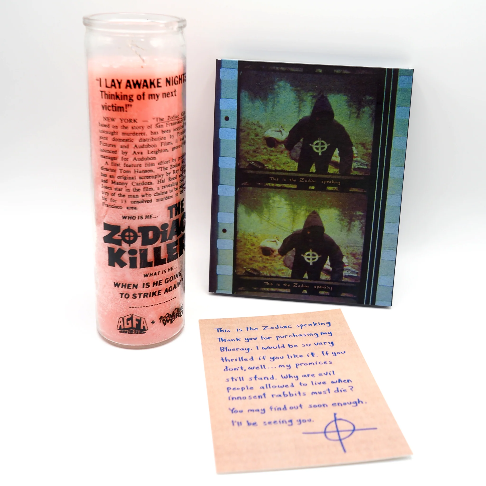 Exclusive Zodiac Killer bundle with candle and postcard, limited to 75 bundles.
